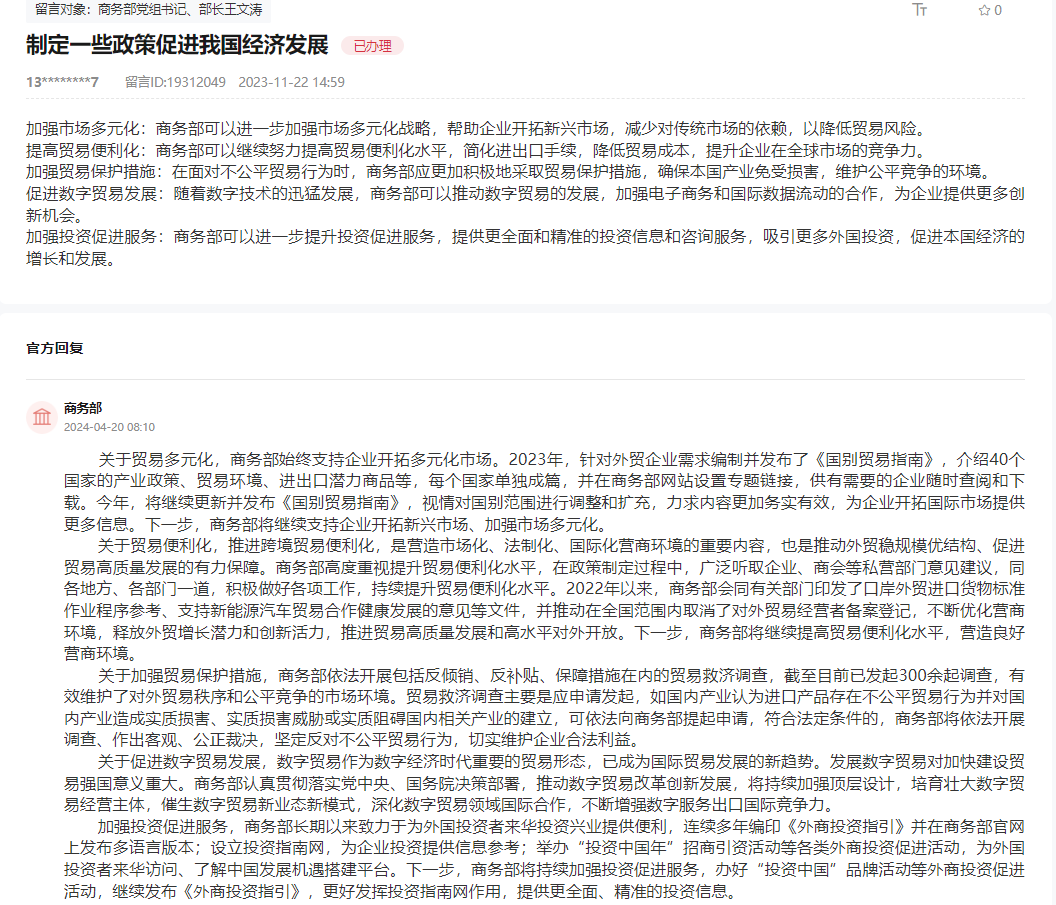 外资外贸连接国内国际两个市场、两种资源,是衡量对外开放水平的重要指标,也是推动我国经济回升向好的重要力量。过去一年,网友通过“领导留言板”积极建言献策,包括加强市场多元化、促进数字贸易发展、加强投资促进服务等与外资外贸紧密相关的问题。